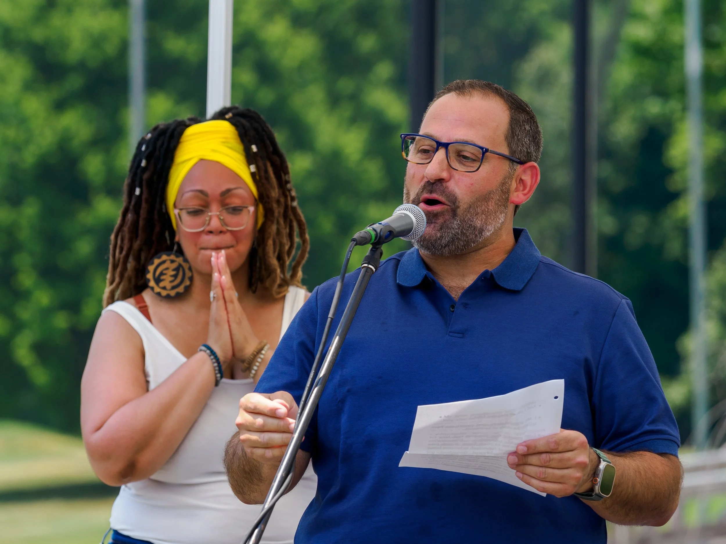 Kojo Ayinde Johnson - West African Percussionist, author, teacher next to SJM Juneteenth Banner